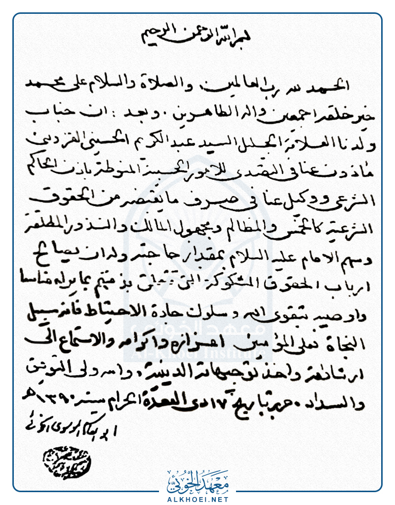 الحمدلله رب العالمين والصلاة والسلام على محمد خير خلقه اجمعين واله الطاهرين. وبعد: ان جناب ولدنا العلامة الجليل السيد عبدالكريم الحسيني القزويني مأذون عنا في التصدي للامور الحسبية المنوطة باذن الحاكم الشرعي ووكيل عنا في صرف ما يقبضه من الحقوق الشرعية كالخمس والظالم ومجهول المالك والنذور المطلقة وسهم الامام عليه السلام بمقدار حاجته وله ان يصالح ارباب الحقوق المشكوكة التي تتعلق بذمتهم بما يراه مناسبا واوصيه بتقوى الله وسلوك جادة الاحتياط فانه سبيل النجاة فعلى المؤمنين اعزازه واكرامه والاستماع الى ارشاداته واخذ توجيهاته الدينية. والله ولي التوفيق والسداد.