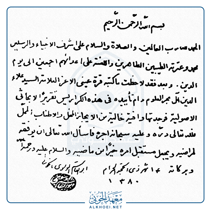 وبعد فقد لاحظت ماكتبه قرة عيني الاعز العلامة السيد علاء الدين آل بحرالعلوم دام تأييده في هذه الكراريس تقريراً لابحاثي الاصولية فوجدتها وافية خالية من الايجاز المخل والاطناب الممل فلله تعالى درّه وعليه سبحانه اجره فاسأل الله تعالى ان يوفقه لمراضيه ويجعل مستقبل امره خيراً من ماضيه والسلام عليه ورحمة الله وبركاته