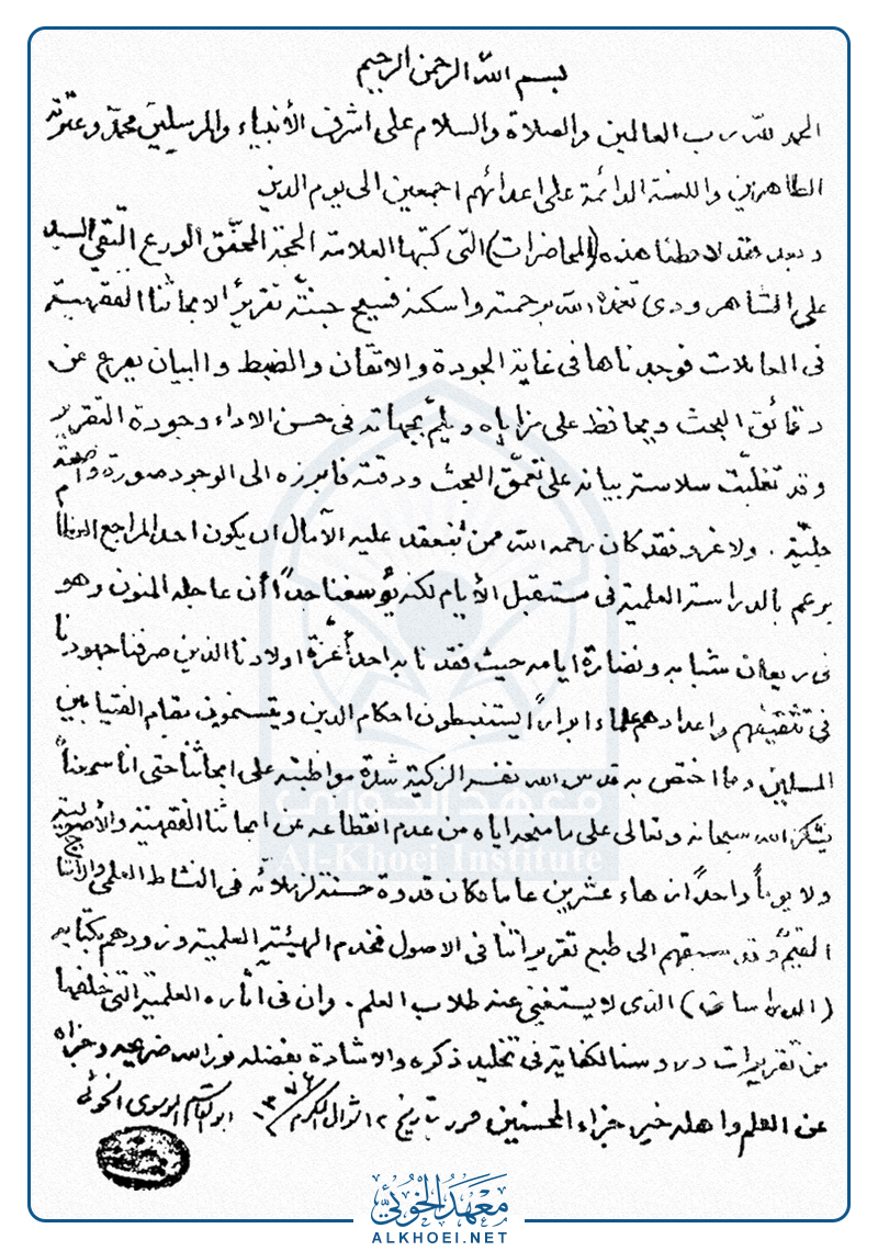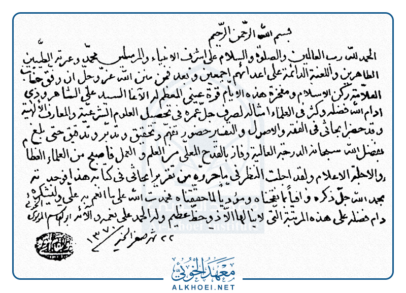 وبعد فمن منن الله عزوجل أن وفق جناب العلامة ركن الإسلام ومعجزة هذه الأيام قرة عيني المعظم له الآغا السيد علي الشاهرودي أدام الله فضله وكثر في العلماء أمثاله لصرف جل عمره في تحصيل العلوم الشرعية والمعارف الإلهية وقد حضر أبحاثي في الفقه والأصول والتفسير حضور تفهم وتحقيق وتدبر وتدقيق حتى بلغ بفضل الله سبحانه الدرجة العالية وفاز بالقدح المعلّى من العلم والعمل فأصبح من العلماء العظام والأجلة الأعلام ولقد أجلت النظر في ما حرره من تقرير أبحاثي في كتابه هذا فوجدته بحمد الله جل ذكره وافياً بما نقحناه ومؤدياً لما حققناه فحمدت الله على ما أنعم به علي وليشكره دام فضله على هذه المرتبة التي لا ينالها إلا ذوحظ عظيم وله الحمد على نعمه وآلائه .