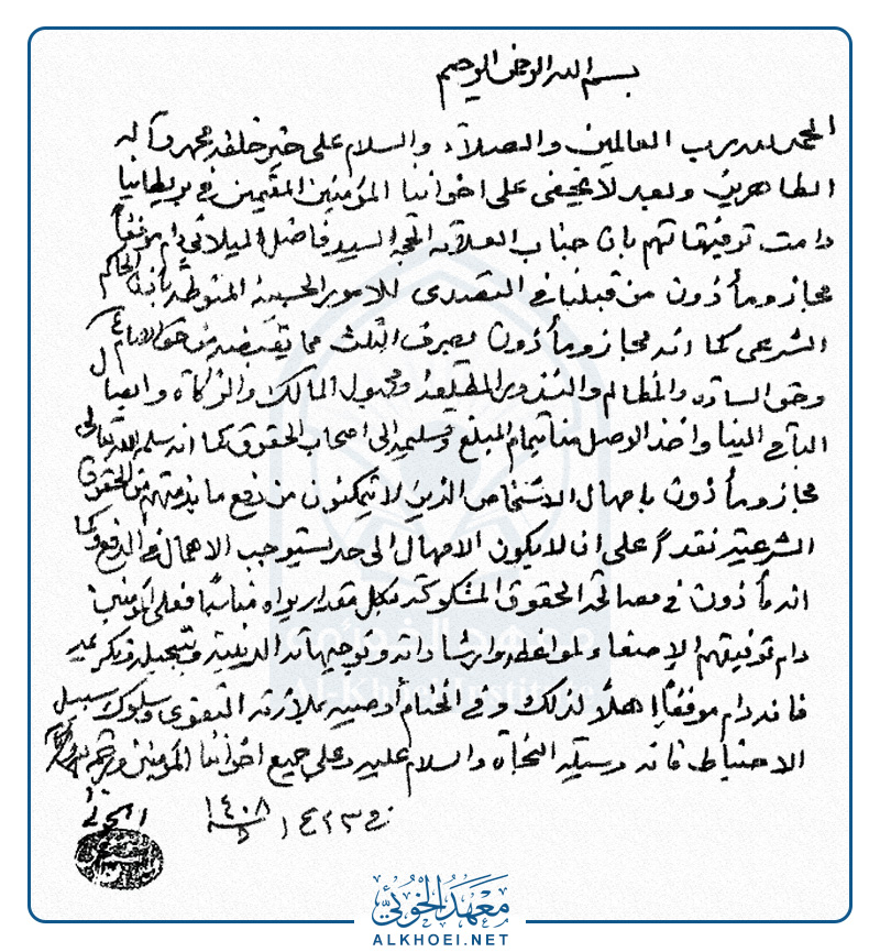 وبعد لايخفى على اخواننا المؤمنين المقيمين في بريطانيا دامت توفيقاتهم بان جناب العلامة الحجة السيد فاضل الميلاني دام موفقاً مجاز ومأذون من قبلنا في التصدي للامور الحسبية المنوطة باذن الحاكم الشرعي كما انه مجاز ومأذون بصرف الثلث مما يقبضه من حق الامام عليه السلام وحق السادة والمظالم والنذور المطلقة ومجهول المالك والزكاة وايصال الباقي الينا واخذ الوصل منا بتمام المبلغ وتسليمه الى اصحاب الحقوق كما انه سلمه الله تعالى مجاز ومأذون بامهال الاشخاص الذين لايتنكنون من دفع ما بذمتهم من الحقوق الشرعية نقداً على ان لا يكون الامهال الى حد يستوجب الاهمال في الدفع وكما انه مأذون في مصالحة الحقوق المشكوكة بكل مقدار يراه مناسباً فعلى المؤمنين دام توفيقاتهم الإصغاء لمواعظه وارشاداته وتوجيهاته الدينية وتبجيله وتكريمه فانه دام موفقاً اهلاً لذلك وفي الختام أوصيه بملازمة التقوى وسلوك سبيل الاحتياط فانه وسيلة النجاة والسلام عليه وعلى جميع اخواننا المؤمنين ورحمة الله وبركاته.