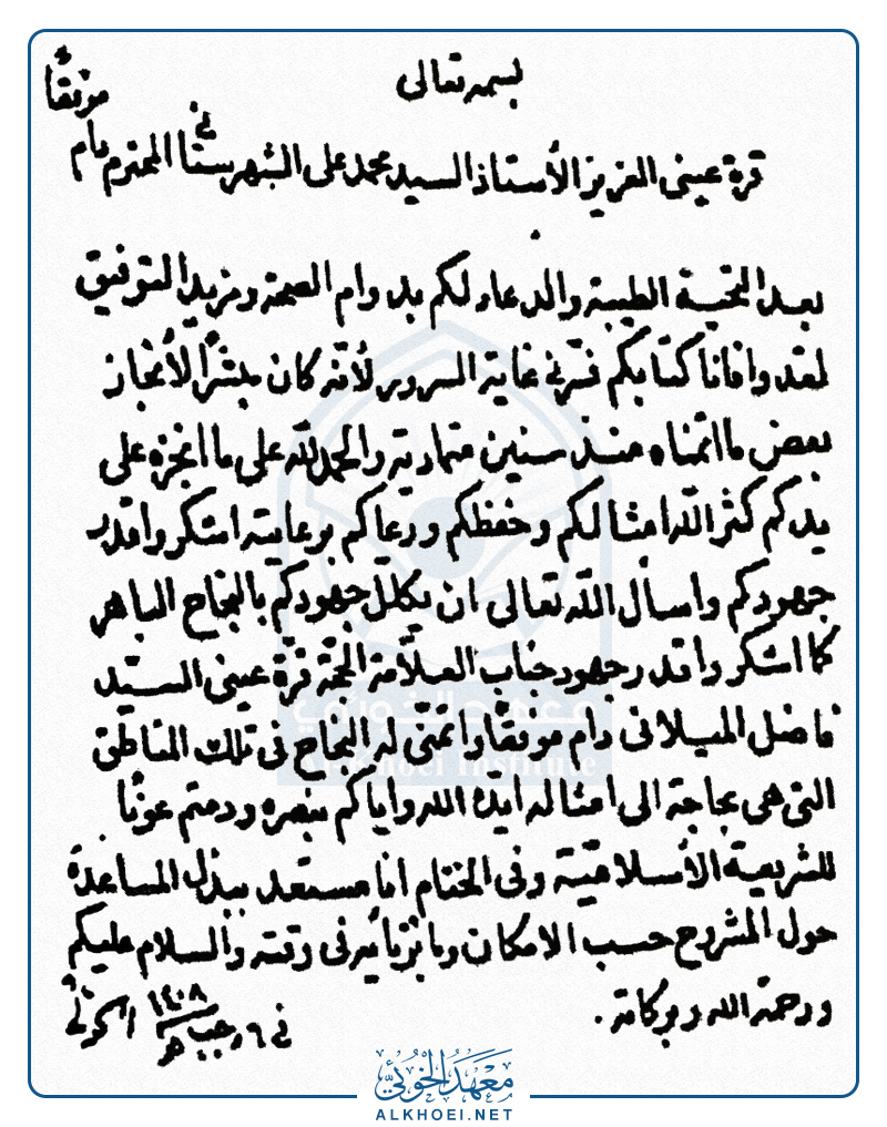 بعد التحية الطيبة والدعاء لكم بدوام الصحة ومزيد التوفيق لقد وافانا كتابكم فسرني غاية السرور لأنه كان مبشر الانجاز بعض ما اتمناه منذ سنين متمادية والحمدلله على ما انجزه على يدكم كثر الله امثالكم وحفظكم ورعاكم برعايته اشكر واقدر جهودكم واسأل الله تعالى ان يكلل جهودكم بالنجاح الباهر كما اشكر واقدر جهود جناب العلامة الحجة قرة عيني السيد فاضل الميلاني دام موفقاً واتمنى له النجاح في تلك المناطق التي هي بحاجة الى امثاله ايده الله واياكم بنصره ودمتم عوناً للشريعة الأسلامية وفي الختام انا مستعد ببذل المساعدة حول المشروع حسب الامكان وما نرتأيه في وقته والسلام عليكم ورحمة الله وبركاته.