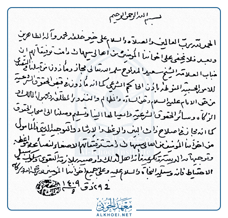 الحمد لله رب العالمين والصلاة والسلام على خير خلقه محمد وآله الطاهرين وبعد فلا يخفى على اخواننا المؤمنين من اهالي سيهات دامت توفيقاتهم ان جناب العلامة الشيخ سعيد المدلوح سلمه الله تعالى مجاز ومأذون من قبلنا في التصدي للامور الحسبية المنوطة باذن الحاكم الشرعي كما انه مأذون في قبض الحقوق الشرعية من حق الامام عليه السلام وحق السادة والمظالم والنذور المطلقة ومجهول المالك والزكاة وسائر الحقوق الشرعية وايصالها الينا وتسليم وصلنا الى اصحاب الحقوق كما انه مجاز في اصلاح ذات البين والوعظ والإرشاد والتوجيه الديني فالمأمول من اخواننا المؤمنين من اهالي سيهات دامت توفيقاتهم الاصغاء لنصائحه ومواعظه وتوجيهاته الدينية وتكريمه فأنه اهل لذلك واوصيه بملازمة التقوى وسلوك سبيل الاحتياط فانه وسيلة النجاة والسلام عليه وعلى جميع اخواننا المؤمنين ورحمة الله وبركاته